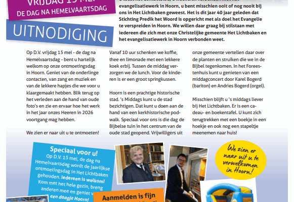 In de herfstvakantie is het 3 dagen feest bij de kinderclub! Er zijn 3 ochtenden vol proefjes, spelletjes, knutselen en een Bijbelverhaal. Kom jij ook? Neem gerust een …